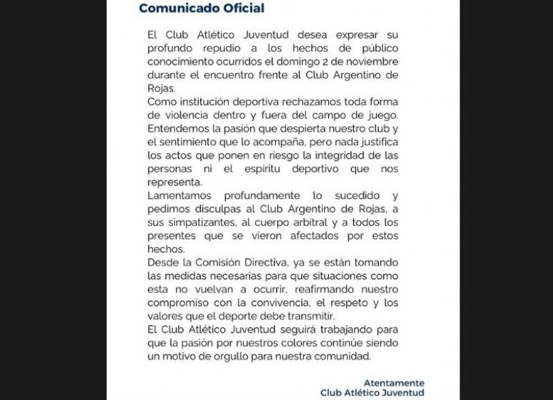 Además, Juventud ofreció disculpas al Club Argentino de Rojas, a sus simpatizantes, al cuerpo arbitral y a todas las personas que se vieron afectadas por los incidentes, asegurando que ya se están tomando medidas para evitar que hechos similares vuelvan a ocurrir.