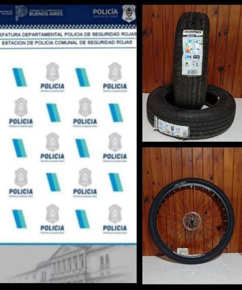 Durante el operativo, realizado en conjunto con la DDI Rojas, se logró el secuestro de dos neumáticos para automóvil marca SUNSET (medidas 175/65/R14) y una rueda completa de bicicleta rodado 29, con neumático marca DSH KOCK, llanta FAST 29 ER y disco de freno colocado.